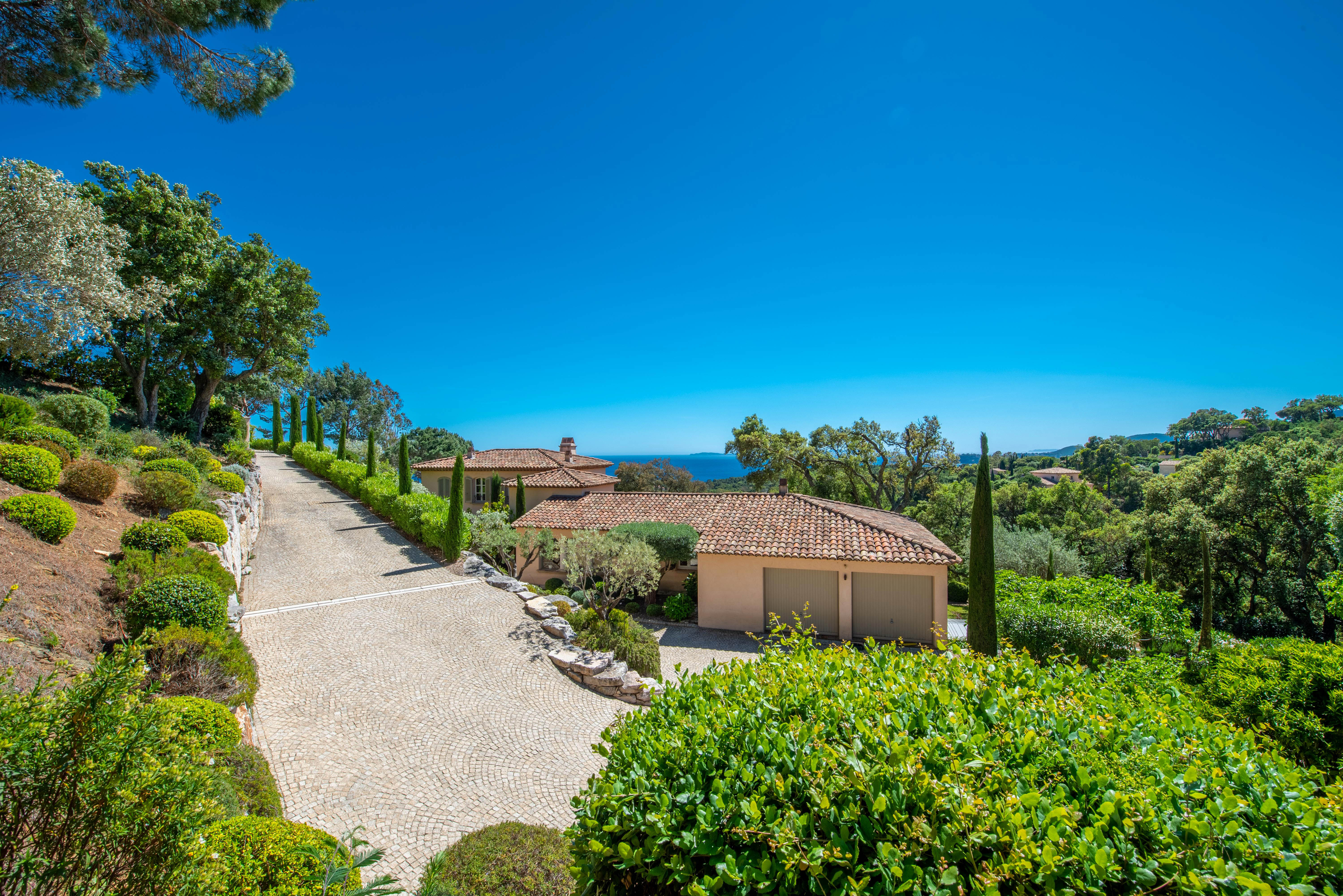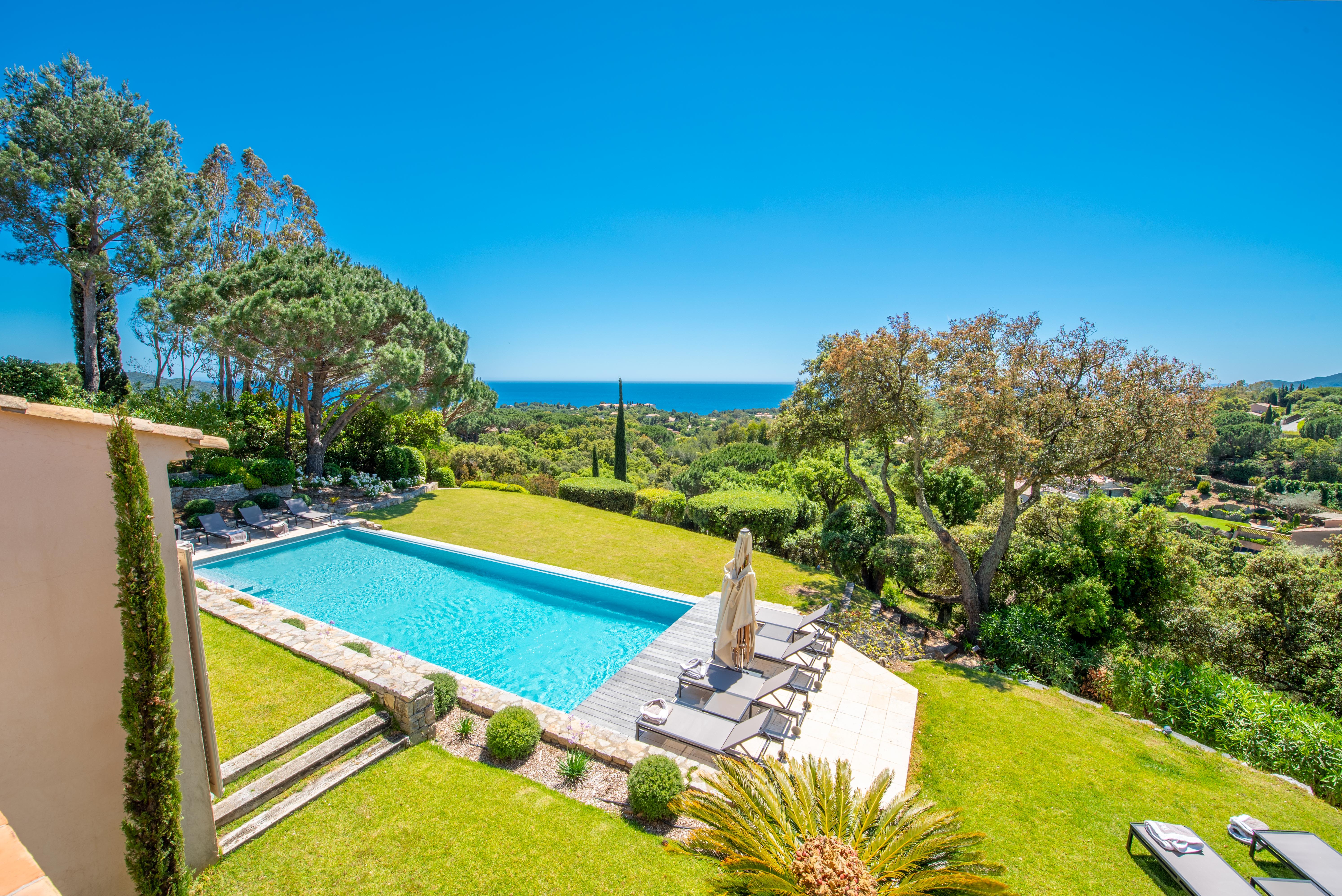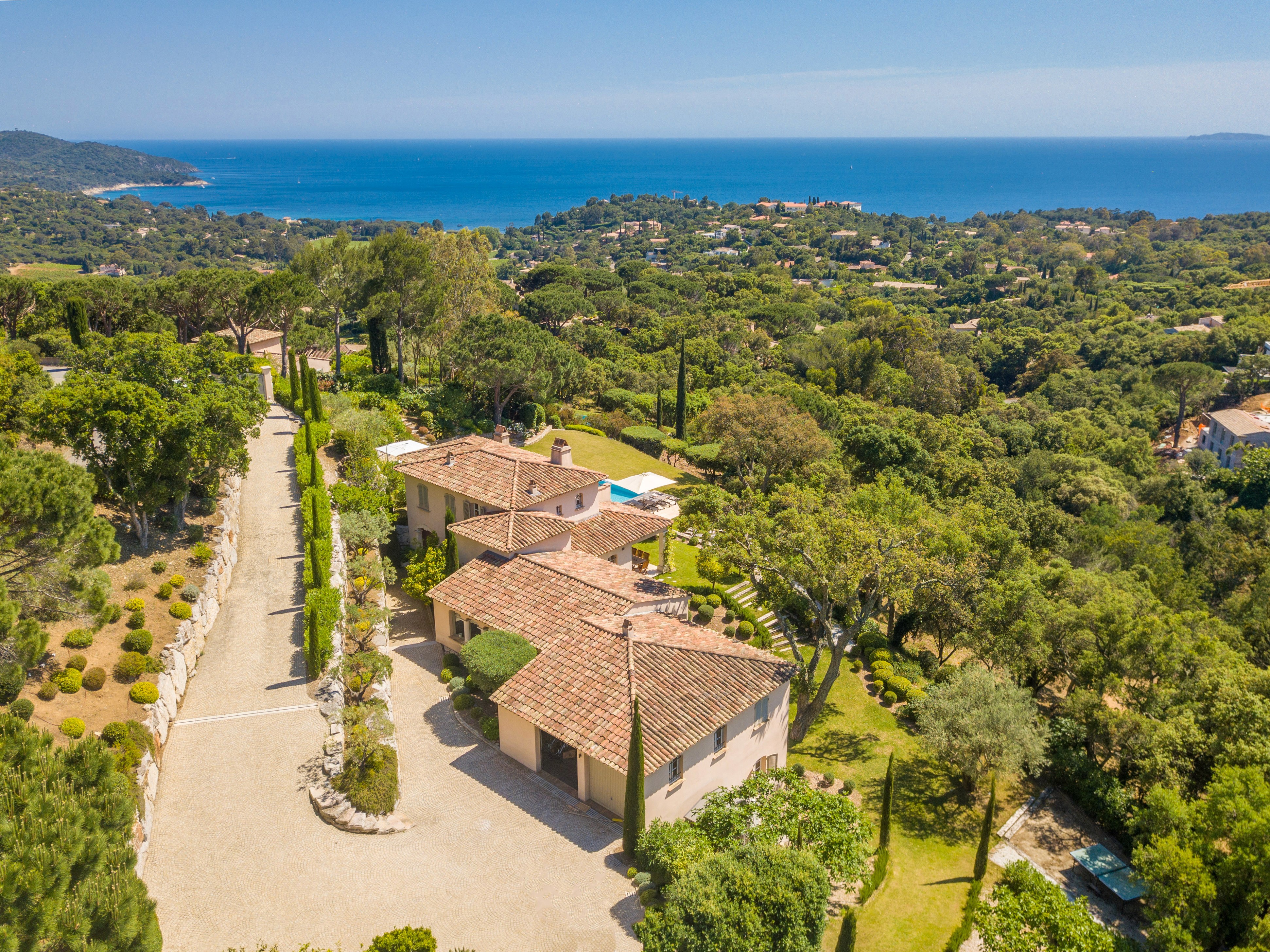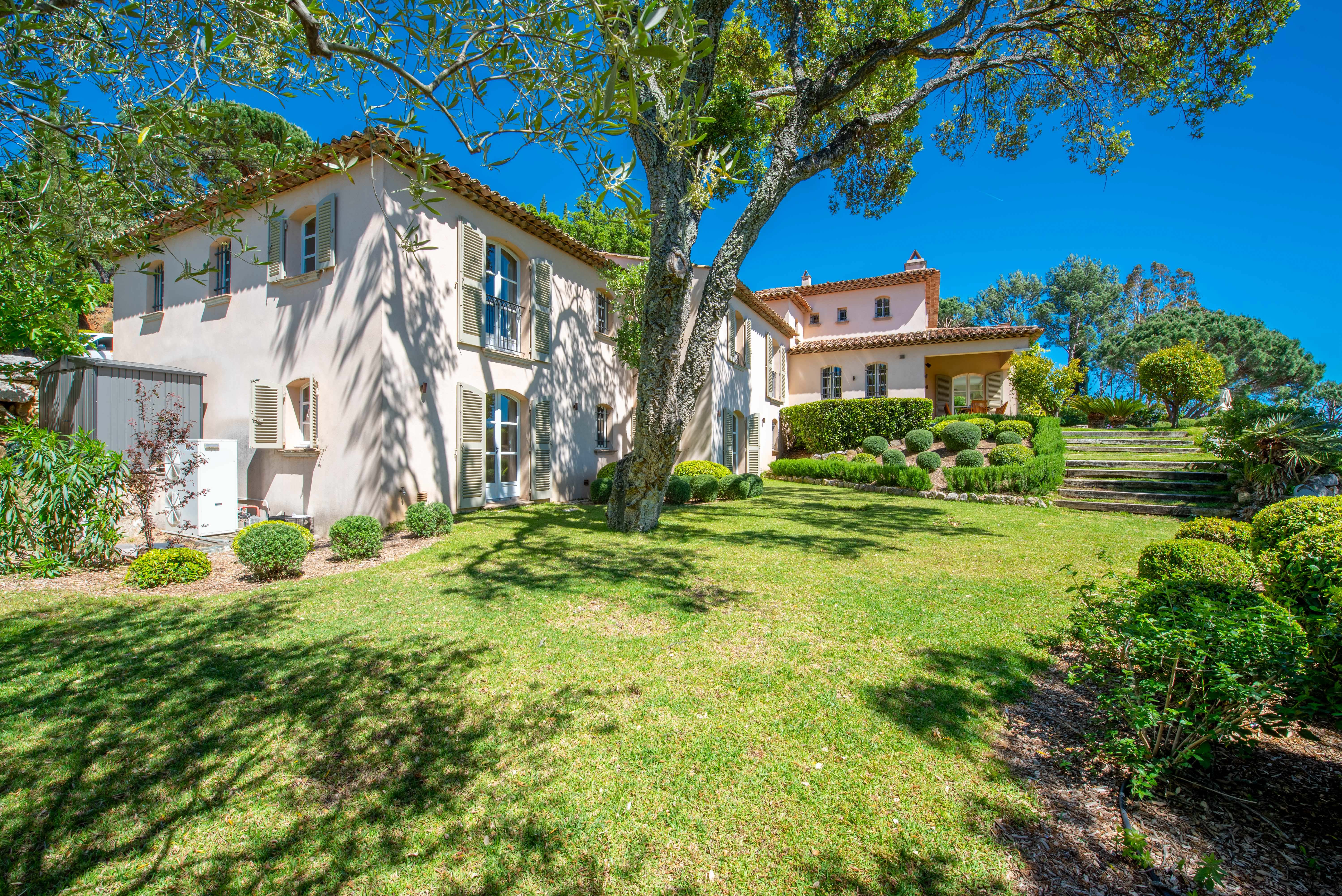 Nestled within a private and secure estate, the villa enjoys a prime location just 5 minutes by car from the beach and 20 minutes from Saint-Tropez, and offers complete privacy with no overlooking neighbors.