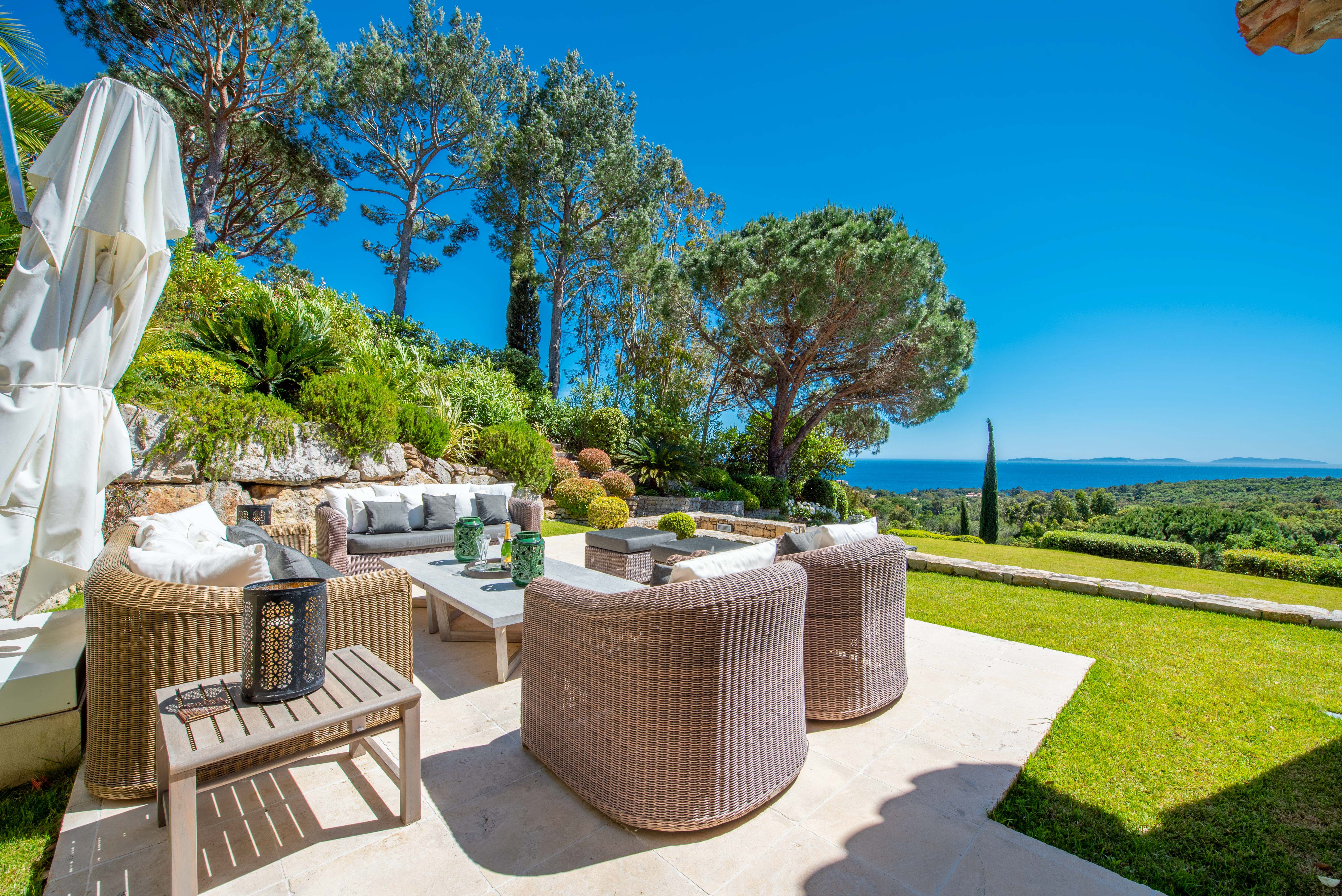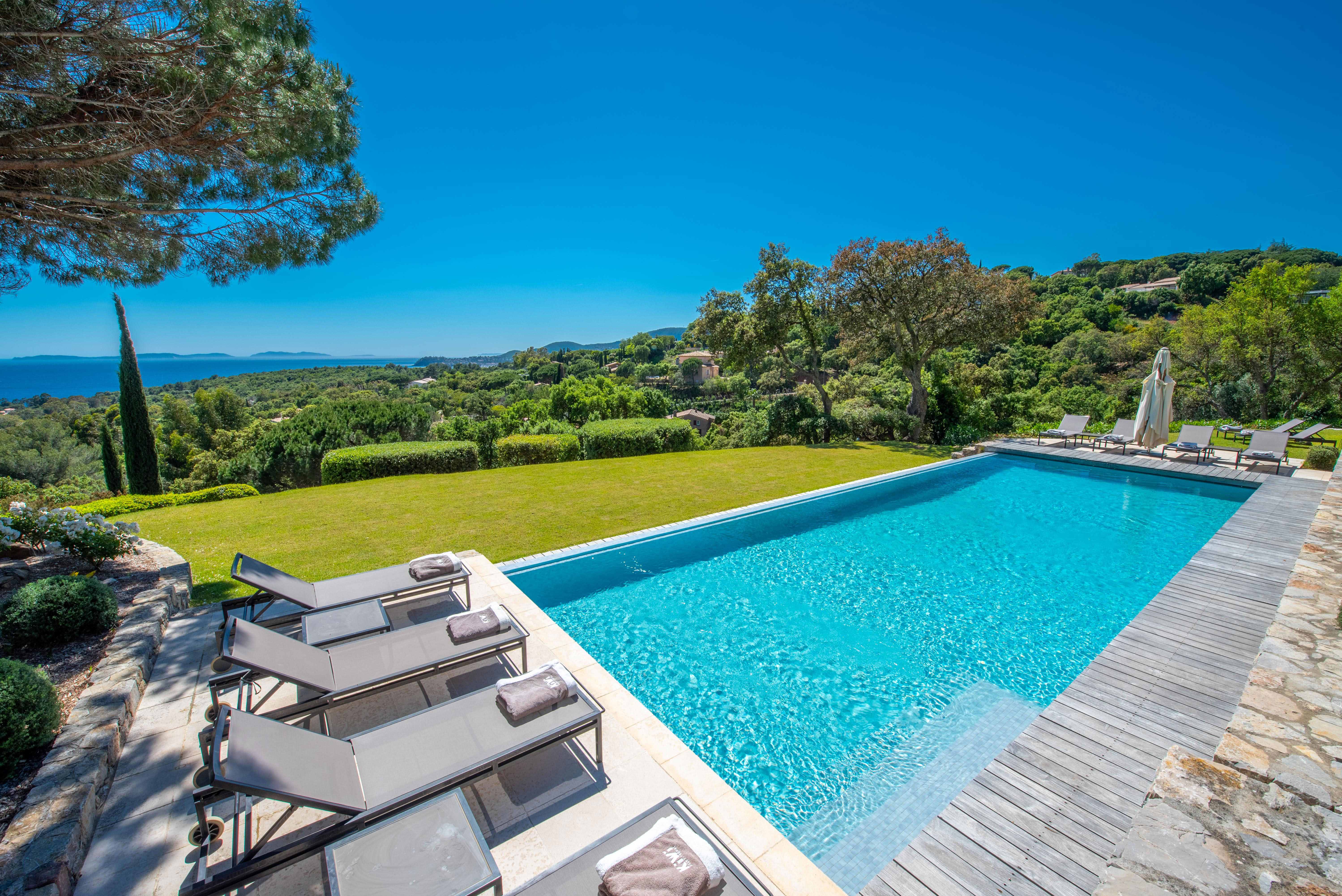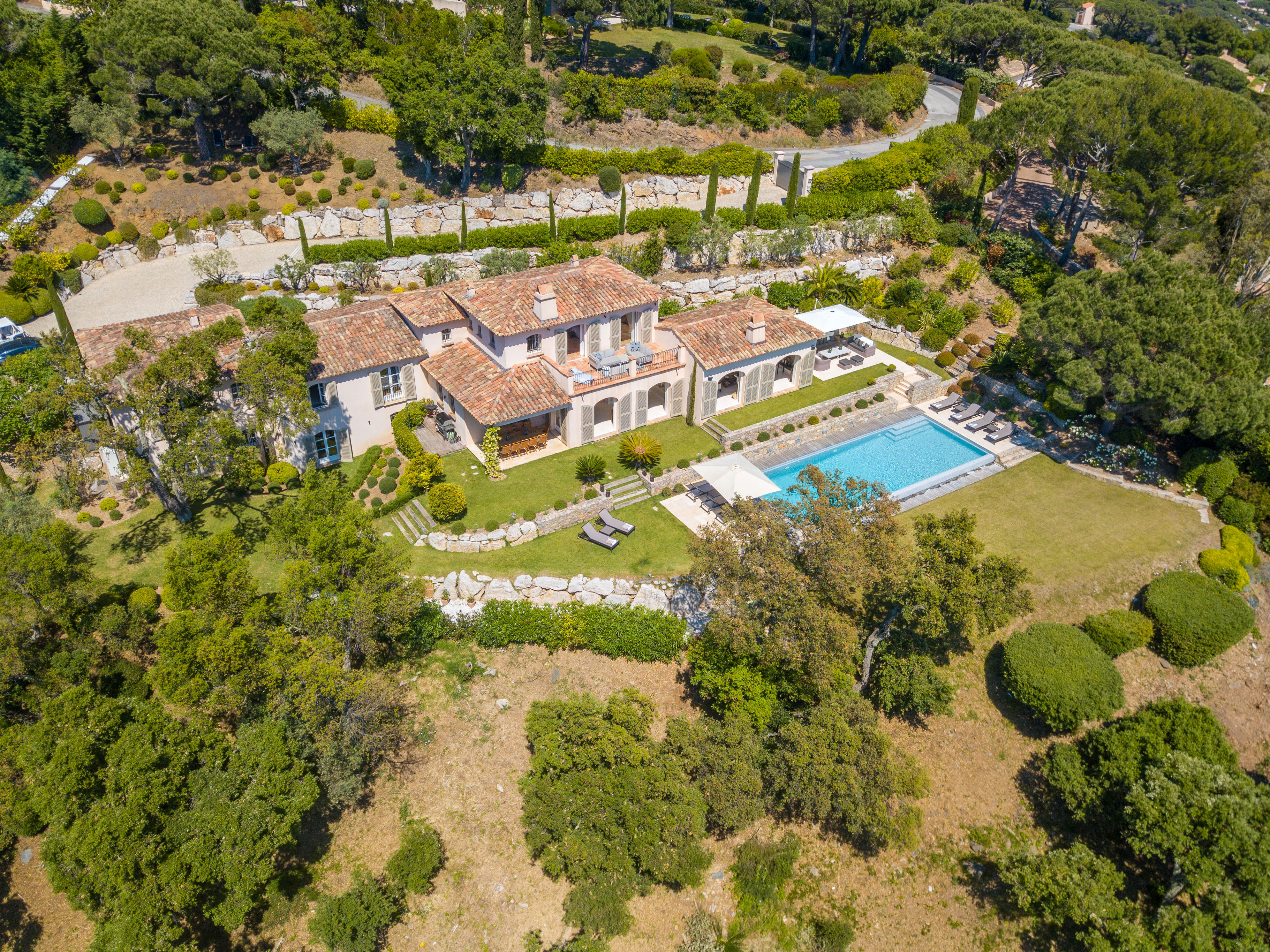 Nestled within a private and secure estate, the villa enjoys a prime location just 5 minutes by car from the beach and 20 minutes from Saint-Tropez, and offers complete privacy with no overlooking neighbors.