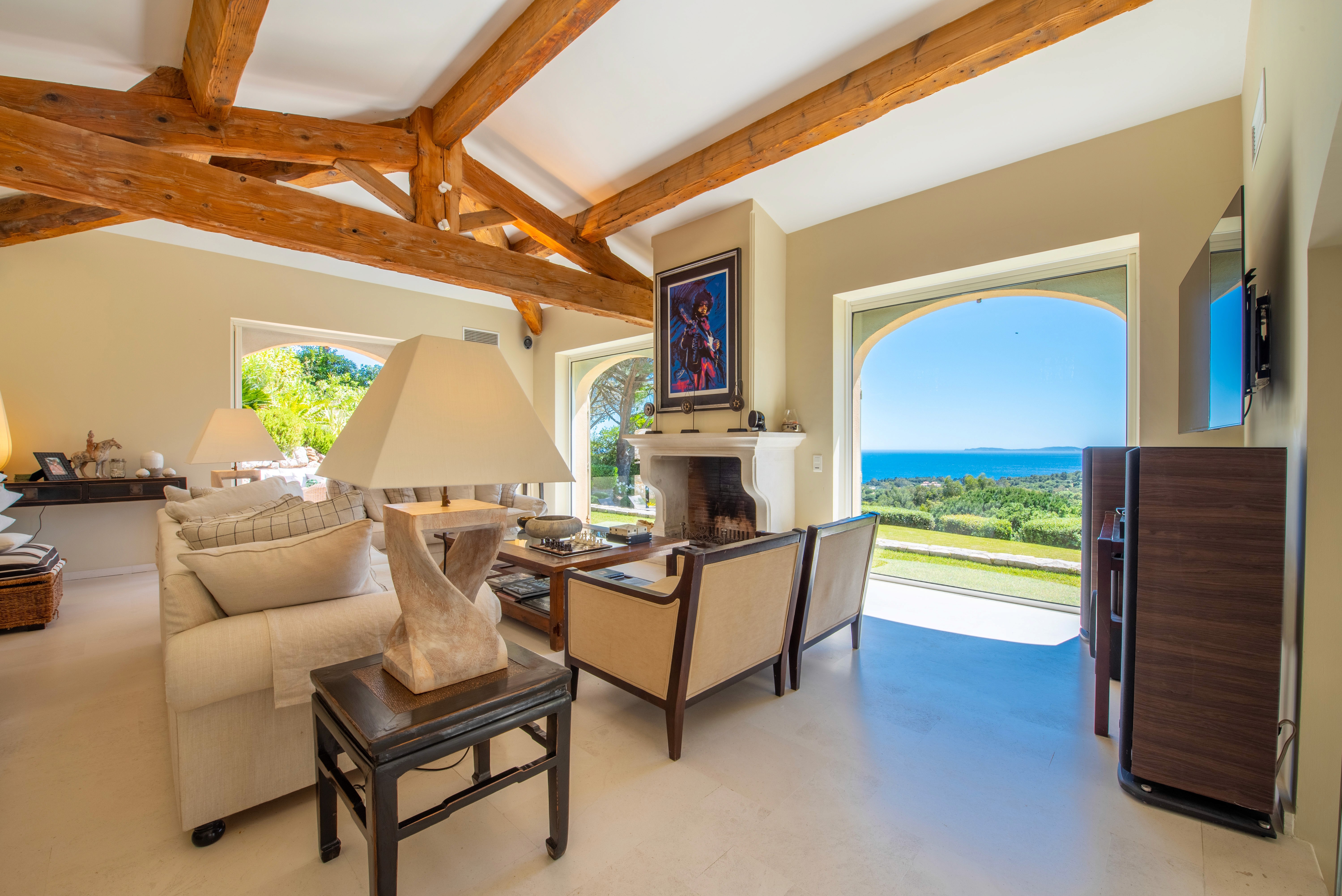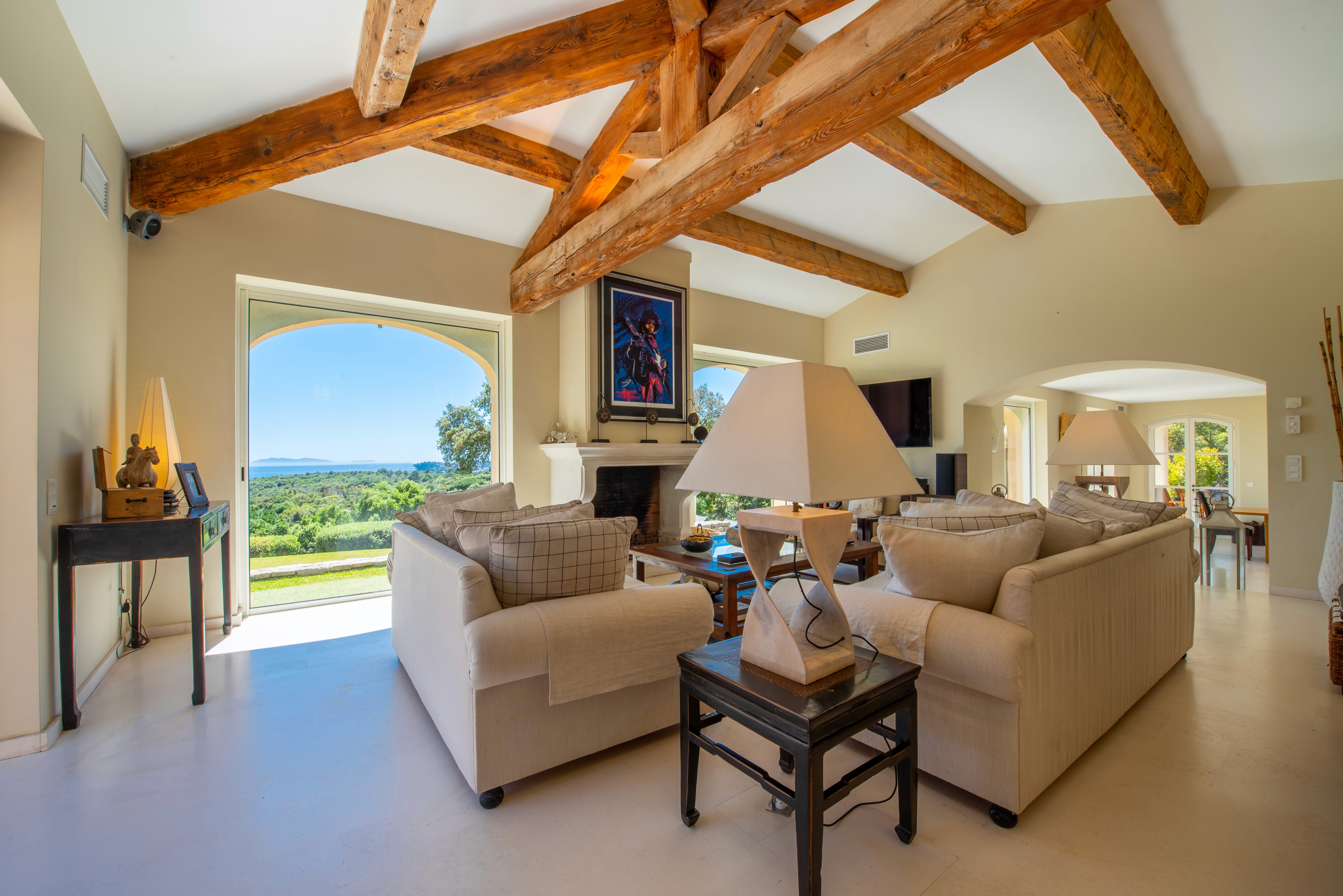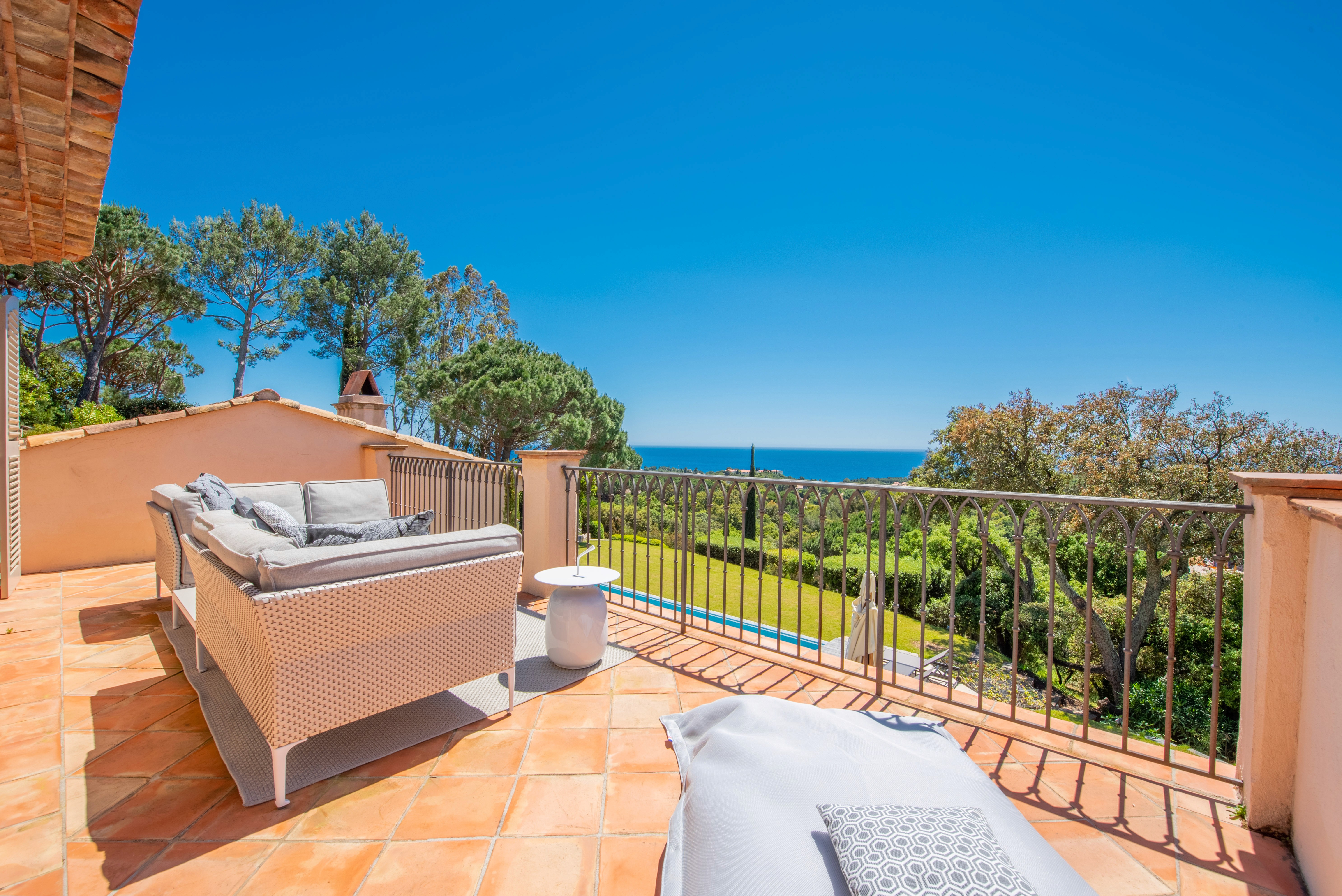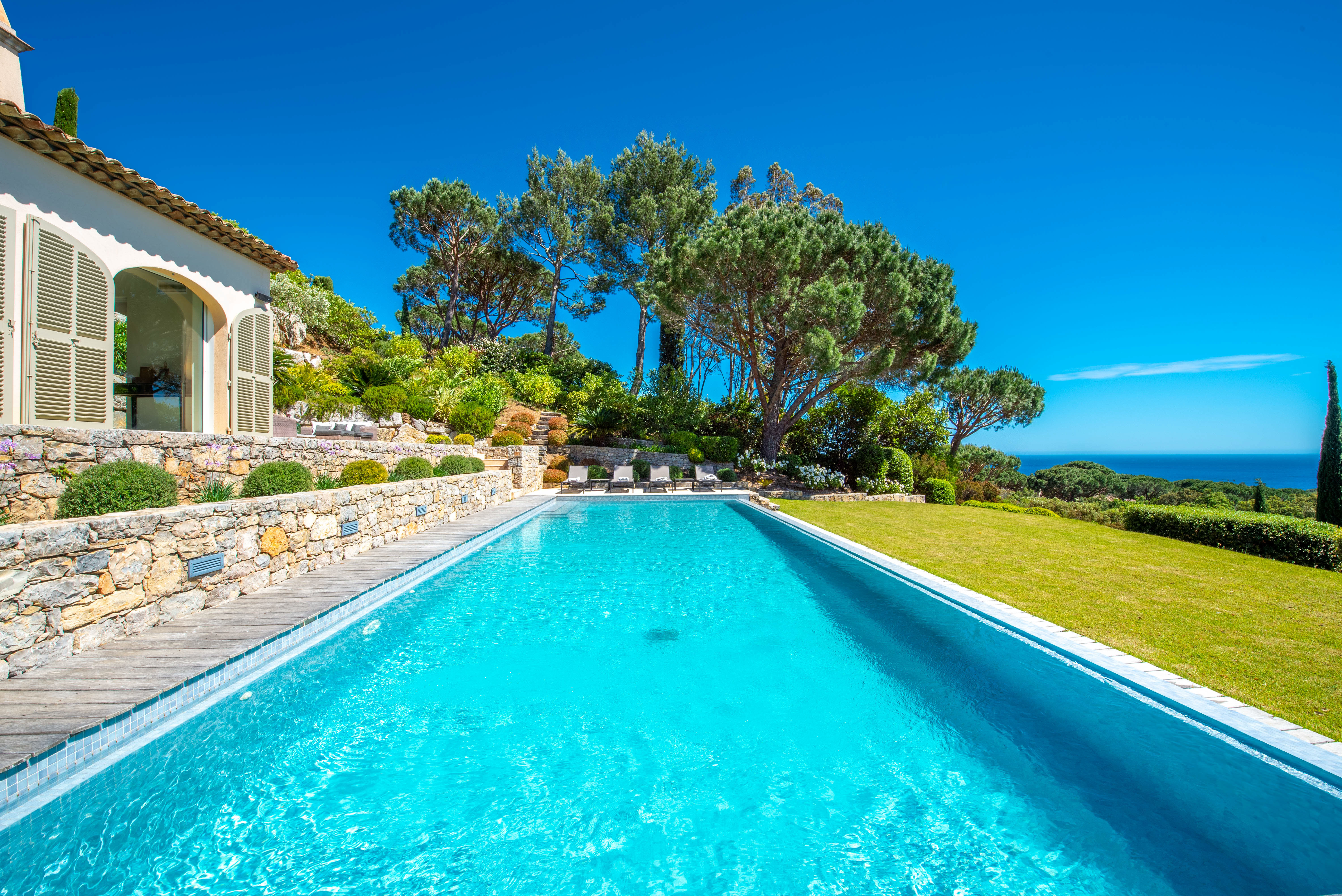 Nestled within a private and secure estate, the villa enjoys a prime location just 5 minutes by car from the beach and 20 minutes from Saint-Tropez, and offers complete privacy with no overlooking neighbors.