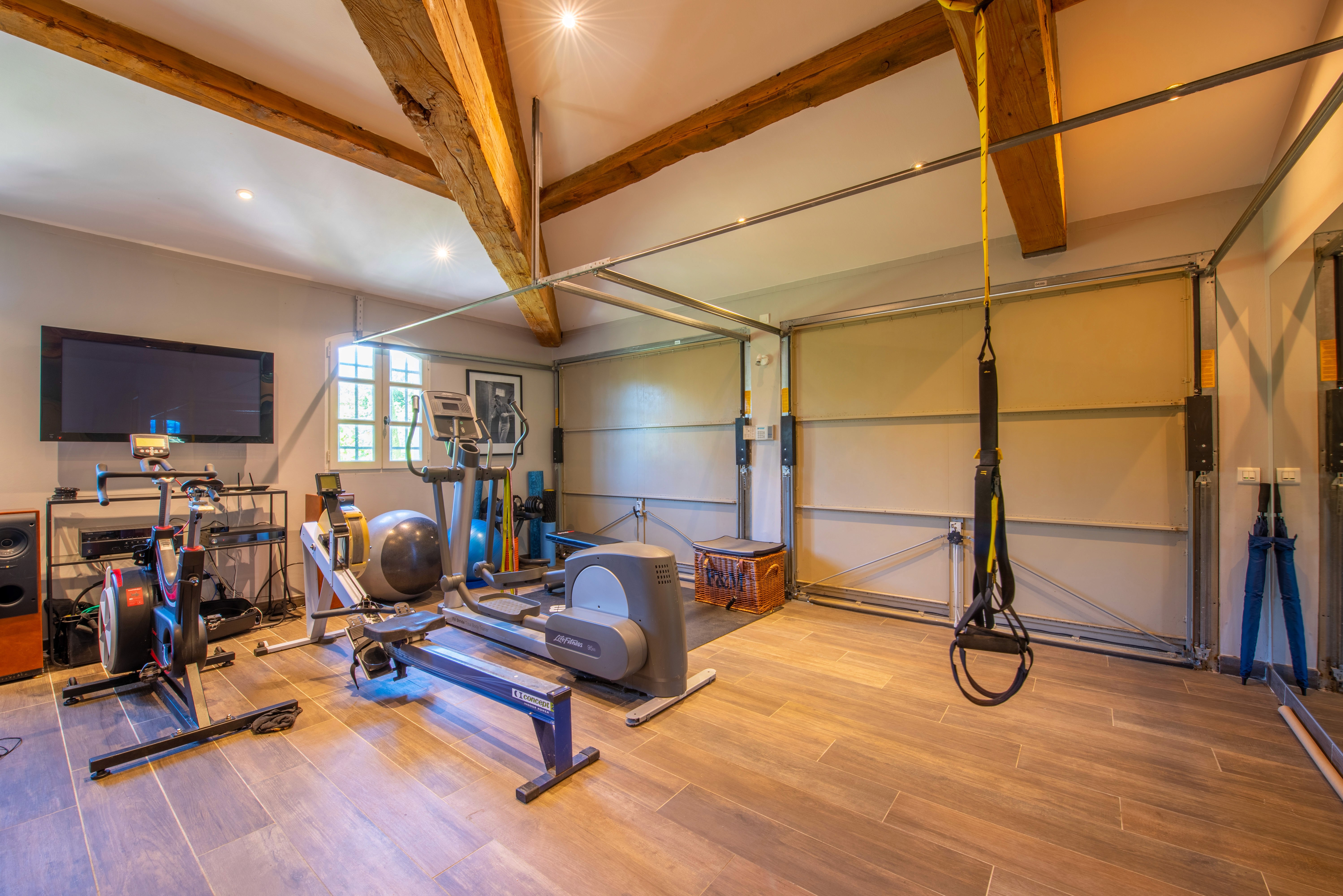 The ground floor hosts the main living areas, including a fully equipped kitchen, a convivial dining room, and a bright living room opening onto the outdoor spaces. This level also includes three en-suite bedrooms, a fully equipped fitness room, and a laundry room for everyday convenience.